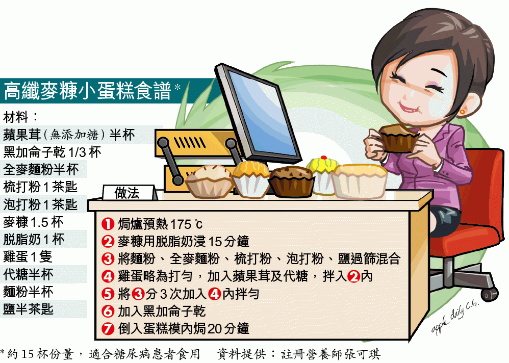 張建議市民可自製杯裝蛋糕,以代糖取代真糖,又或以蘋果茸、提子乾及藍莓乾等天然甜味代替糖份,減少用糖量,並加入纖維較高的麵粉如全麥麵粉等,可減低血糖上升速度。