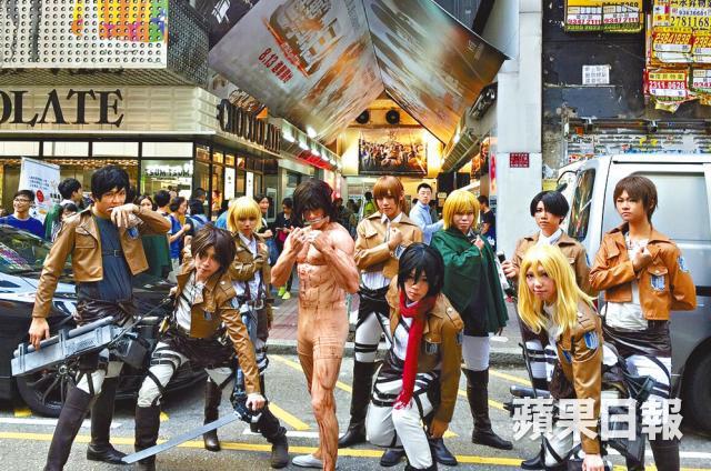 除了日本之外,香港亦有一班《進擊的巨人》擁躉愛cosplay片中角色造型,為數二十多人的《進擊》迷,早前就齊扮成片中的調查兵團及巨人到動漫展,特地為電影宣傳,他們又曾殺到旺角,於戲院外拍照,吸引大批途人圍觀,並以片中角色造型入戲院預先買《進擊》電影戲票,夠晒投入。