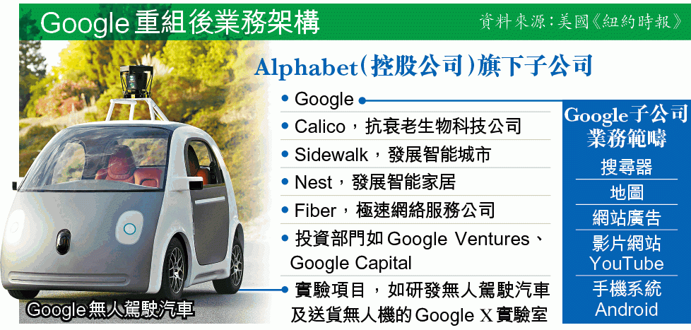 美國科網巨擘Google重組,變身「子母」公司。Google宣佈成立新的控股母公司Alphabet,原Google變子公司專注搜尋器、廣告、地圖和影片等核心業務,無人車、智能家居等業務拆出歸Alphabet管。此舉令原Google不同業務業績透明度增加。日後搜索仍是Google的招牌,但無人車等其他產品,或要由「Google車」改口叫「Alphabet車」。