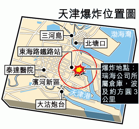 由於擔心會引發更大的災難,解放軍北京軍區214名官兵組成的國家級核生化應急救援隊,昨趕到現場,與武警8360部隊防化分隊一同在爆炸的核心區進行救援。在天津直擊的《蘋果》記者昨午見到多輛有「核生化應急救援」字樣的車輛,在現場巡邏視察。