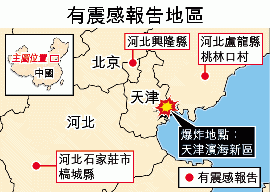 中國地震台網先後在前晚兩次爆炸時,分別錄得黎克特制2.3級和2.9級地震,由此推斷出兩次爆炸所釋放的能量,在數十公里外的河北省亦感到震動。而爆炸引發、20多層樓高的火燄,連日本「向日葵」Himawari-8氣象衞星都拍到。