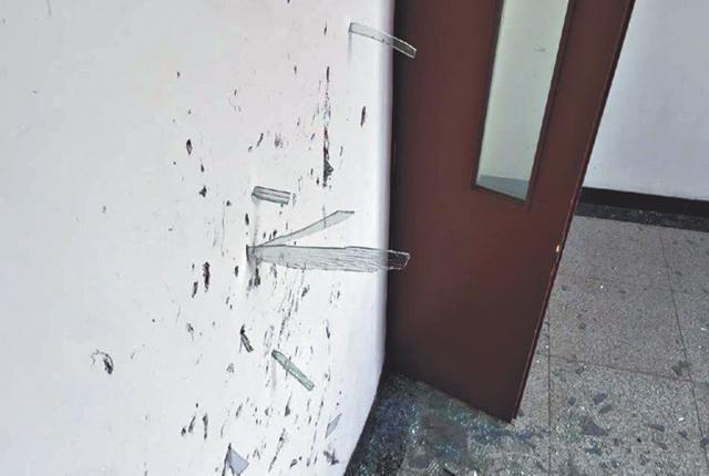 天津海關大樓的玻璃被炸碎後,如刀片般刺入牆壁。
