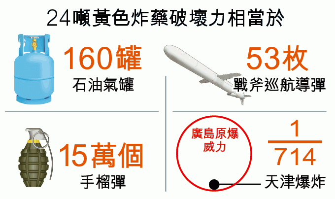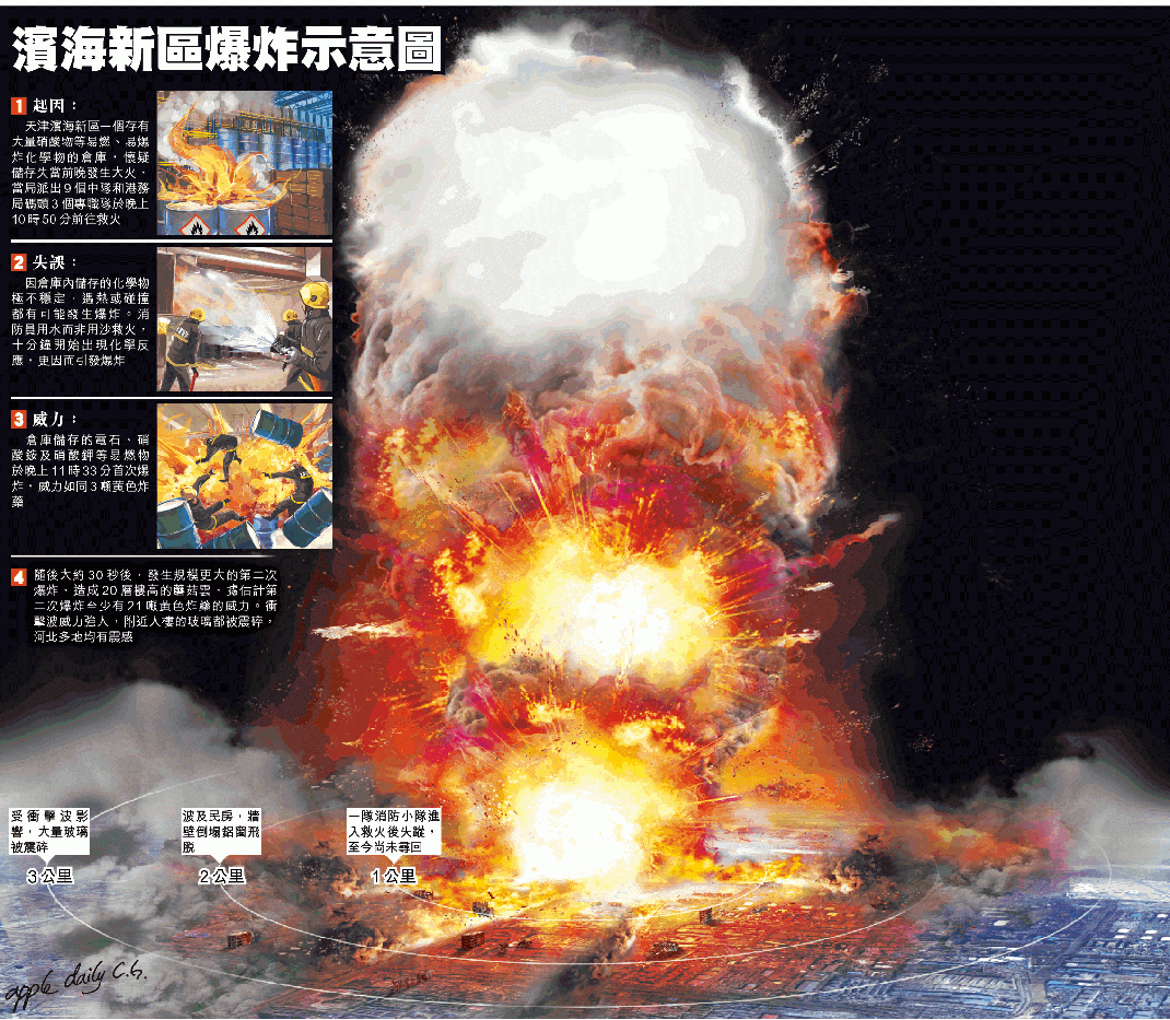 天津濱海新區化工倉庫的爆炸,威力相當強大,周圍幾近夷為平地,如同廢墟。學者估計頭兩次爆炸威力,相當於24噸黃色炸藥、或53枚美國戰斧巡航導彈、15萬個手榴彈同時爆炸的威力,爆炸的威力引發近3級地震,距離現場數十公里處都感到震動。當局目前雖不透露爆炸原因,但消防員估計貨倉內大量電石、硝酸鉀、硝酸銨等物質引發爆炸。