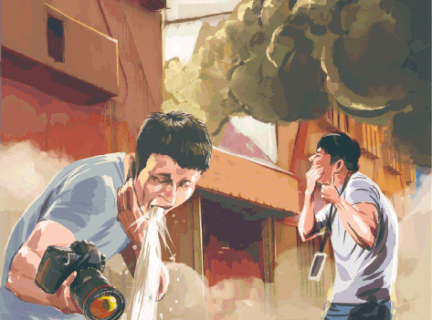 昨日下午火勢仍然持續,現場不時發出悶響,冒出不同顏色的煙霧及傳出刺鼻氣味,不少記者感惡心及嘔吐。