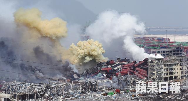 天津發生恐怖化工大爆炸﹗當地一家被民居環繞、儲存大量易燃及帶毒化學物的倉庫前晚發生連環爆炸,產生達20層樓高的蘑菇雲,就連美國和日本的衞星都能清楚拍到火光。爆炸威力巨大,就連10公里以外亦有人稱被衝擊波波及受傷,四周頹垣敗瓦。官方稱至昨晚至少50人死亡,701人受傷,包括4名港人;倉庫儲存700噸含劇毒的氰化鈉(山埃),部份更已流入地下水。現場昨午毒氣瀰漫,居民爭相逃亡,有警員更在《蘋果》記者面前着其家人速逃!
