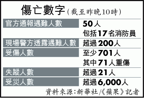 爆炸地點數公里內民居被毀,大批民眾受傷逃到街上,醫院均爆滿,至昨晚至少50人死亡,701人受傷,包括4名香港人、1名台灣人及2名韓國人,超過6,000人受災。據知其中兩名港人已經出院,仍留醫的兩名港人則無生命危險。而第一批進場救火的消防員則全數失蹤,至昨晚共17名消防員證實殉職。《蘋果》記者從現場警員口中得知,至少有120名消防員及武警進入現場救援,但僅得4人能出來,加上市民合共有超過200人罹難,為官方通報的四倍。據了解,發生慘劇是由於倉庫儲有大量容易爆炸的硝酸化學物,但消防員卻誤用水撲滅,硝酸化學物遇到碰撞隨即引爆。火勢至昨午雖已受控,但仍有火光,不時發生小規模爆炸。《蘋果》記者到距離現場約一公里的天台觀察,見爆炸地點一片廢墟,不斷冒出不同顏色氣體,更聞到刺鼻氣味。