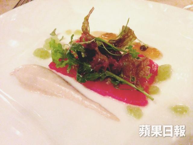 緊接其後的烤八爪魚是全晚亮點。廣東人或許很擅長烹煮魷魚、墨魚,但說到煮八爪魚卻不得不承認意大利人才是高手。八爪魚纖維粗糙,處理失當很容易變韌,但Chef Mauro卻自信地將八爪魚厚切,碟上那條烤八爪魚的厚度,至少跟我三隻手指併在一起差不多粗壯。很害怕入口時會像吃橡膠般,但用刀切下去那刻,我就知道擔心是多餘的。蘸上羅勒香蒜醬,再配上一片紅菜頭放入口,細細品嘗那八爪魚質感完美的演繹。