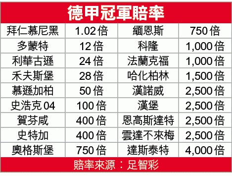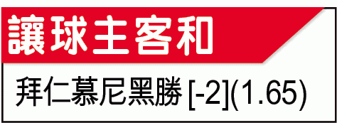 拜仁無論狀態抑或實力均在漢堡之上,而且主場對賽成績一面倒佔優,近五次於聯賽迎漢堡,全勝之餘並轟了31球,其中料在周五踢正選的洛賓就包辦了八球,包括上季梅開二度助球隊狂數8:0。故此,拜仁這三分幾可肯定能袋袋平安,必捧[-2]「主勝」。