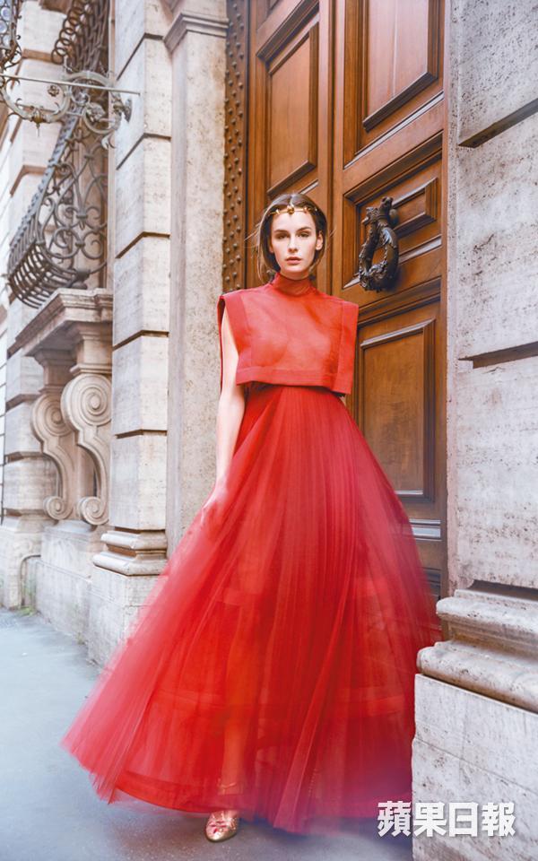 紅,在Valentino的世界有着特別神聖的地位。La Jeanne長裙莊嚴祭師式的方巾,伴隨飛揚飄逸的裙襬,既神聖也誘惑。
