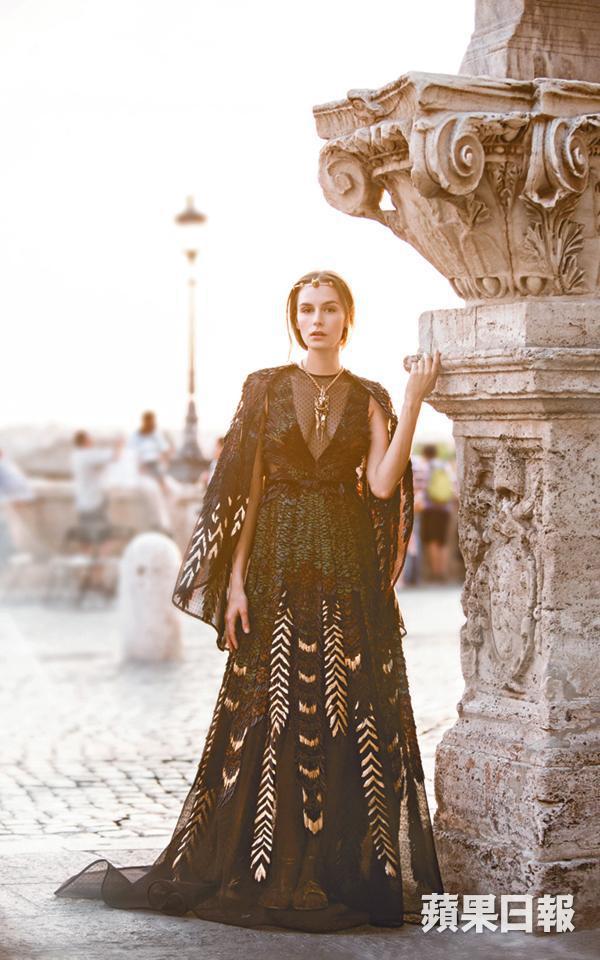 巨型鳥房中的飛鳥?設計師創作時,是想像這樣的畫面嗎?飾滿黑色及幻彩綠羽毛雪紡裙,裙子恍如羅馬鬥士袍上的長形皮革裝飾條,伴隨金色星座圖案,譜出自由的靈魂。