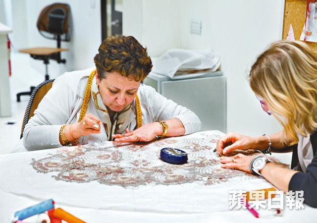 Valentino所有高級訂做服及婚紗等,全都在羅馬總部的Atelier工藝坊製作。七十位工藝師,年資最長的超過42年,一針一黹也完美追求,看似簡單、輕薄的一塊蕾絲布,卻是將蕾絲花紋逐一剪下,再重新拼貼刺繡出新花紋圖案。一襲百褶裙上的垂摺,全由一個工藝師完成,確保褶子之間的距離一致;似透明、輕如無物的紗網,內裏卻包含四、五層不同料子,其一絲不苟,更連熨衣工序也採用古老按壓方式,用上近45磅重量的古董熨斗,而不是熱力去將衣料壓平。