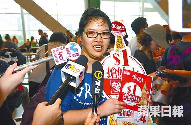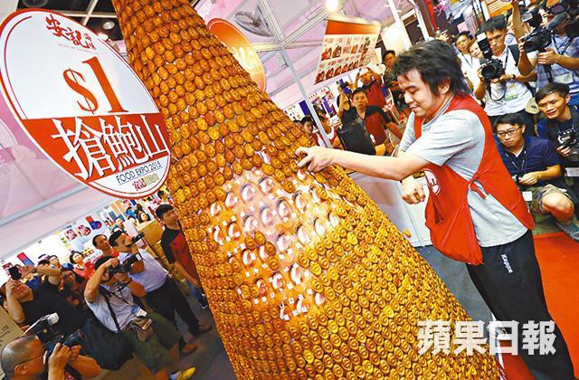 美食博覽昨早10點開幕,逾200名想搶平貨的市民飛奔入場,有男士不慎仆倒。安記的1元「搶鮑山」,參加者包括通宵排隊的女學生楊小姐,10名幸運兒分兩隊,各派1名男士作代表,在3米高、掛滿鮑魚模型的鮑山爭奪鮑魚。結果王先生搶得150隻,為每名隊友各贏得19盒、值逾6,000元的即食鮑魚;另一隊則搶到118隻,每人亦各獲總值逾4,000元鮑魚。安記董事總經理潘權輝指參加者成績超乎預期,「佢真係唔錫住我」,期望展期銷售額有10%增長。