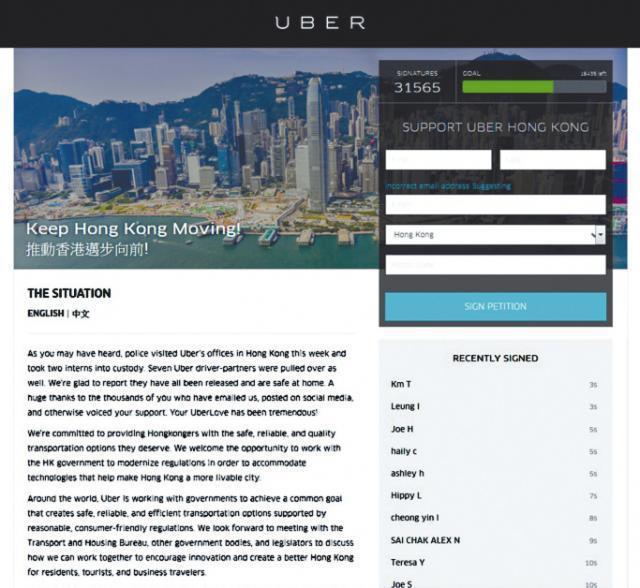 【本報訊】全球最大call車手機應用程式Uber被警方高調拘控後,昨發表「霸氣」回應,號召港人網上簽名表態支持Uber續在港運作,截至昨晚10時,有逾3萬人簽名支持。Uber又提出與當局對話,探討推動新科技交通模式,暗諷港府一方面聲稱要發展新科技,一方面卻封殺新科技。
