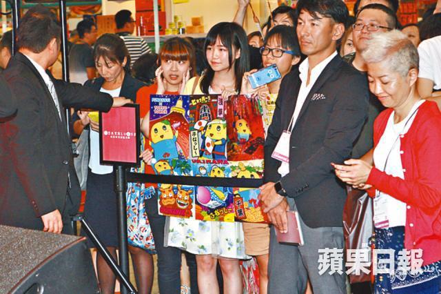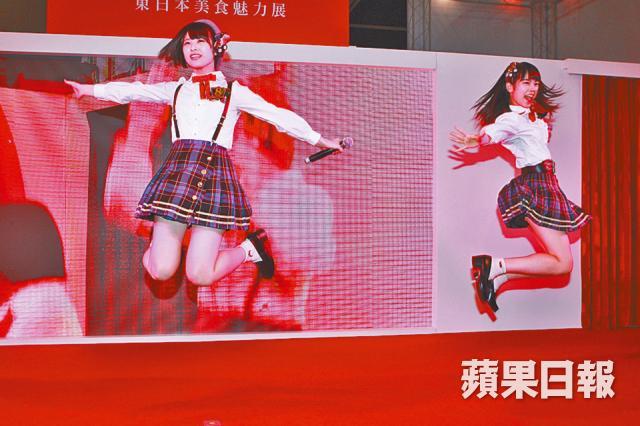 日本組合AKB48的Team8三名成員清水麻璃亞、佐藤栞及吉川七瀬,昨日上午率先現身美食博覽,三人到日本攤位視察,沿途被大批粉絲包圍。她們以應援大使身份出席「東日本美食魅力展」開幕禮,一上台粉絲即瘋狂尖叫,三人又唱又跳,亦用有限的廣東話介紹自己。