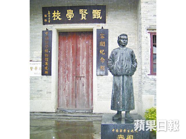 容閎雖生於貧窮之家,父親將其送往傳教士開辦的私塾,及後到美國留學,是第一位在耶魯大學畢業的中國學生。他回國後更向曾國藩提出幼童留學計劃,是將西方思想帶進中國的功臣。圖為他於1871年在香山設立的甄賢學校。