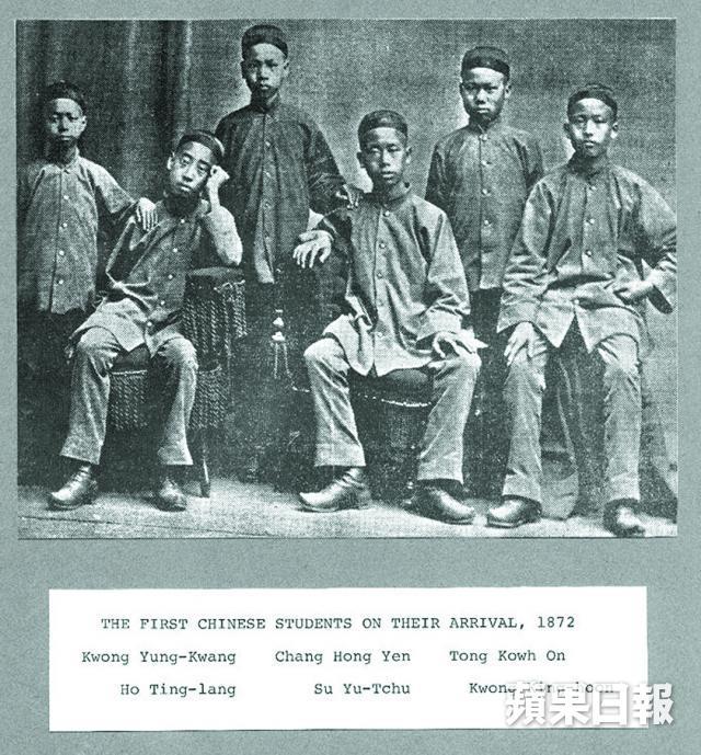 容閎提出的「1872年幼童留美計劃」第一批留學學生到美國後留影,後排最右是清華大學創辦人唐國安。