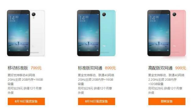 價錢方面亦相當進取,最便宜的移動標準版,配備2GHz處理器、2GB RAM及16GB ROM,售價為799人民幣(約港幣$968);支援移動聯通雙4G版本售899人民幣(約港幣$1,089),配備與移動版相同;而售價為999人民幣(約港幣$1,210)的高配版支援雙網絡4G,處理器速度提升至2.2GHz,儲存空間提升至32GB,用家可根據需要選擇不同配備。