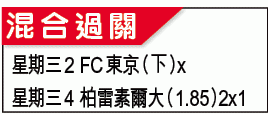 周三日聯盃八強首回合賽事,柏雷素爾主場迎戰神戶勝利船。主隊近期頻頻在地頭失威,今仗勢必全力搶攻力圖反彈,入球肯定不少,捧入球「大」。(球賽編號:星期三 4;有線64及203台今日6:00pm直播)