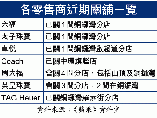 零售市道持續下滑,商家面對黯淡前景,只好關舖節流。過去半年,已超過七間連鎖零售商表明開始關舖,近月確認會關閉的旺區分店至少達11間(詳見表),大多位於銅鑼灣一線位置。商家坦言調整不是「陣痛」而是「長痛」,目前仍要視乎業主減租幅度,否則關店可能陸續有來。