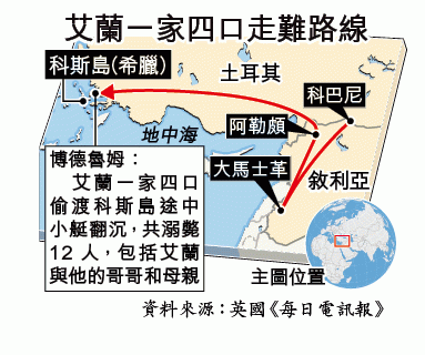 所有夢魘始於本周二晚,尚烏和妻子里恩(Rehan)帶着3歲幼子艾蘭及5歲長子加利普(Galip)登上橡皮艇,和其他偷渡船民由土耳其穆拉附近的度假勝地博德魯姆,偷渡往希臘科斯島。然而開船不久,海面颳起巨浪,船長嚇得跳海逃生,尚烏硬着頭皮掌起舵來,小艇開始入水,船民嚇得死去活來,小艇最後翻側:「我握着妻子雙手……孩子們從我的手上溜走。我們嘗試抓緊救生艇,但它漏氣漏得很快。」包括艾蘭、加利普及里恩在內的12名船民死亡。