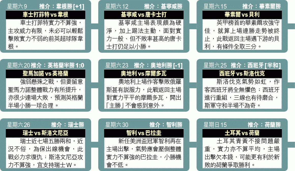 歐洲各主要聯賽剛展開,今周開始小休,以讓路給國家隊出戰,歐洲進行歐國盃外圍賽,其餘便應付世界盃外圍賽或國際賽。今周的重心推介是瑞典作客對剛換帥的俄羅斯,敲「讓球主客和」「客勝」。