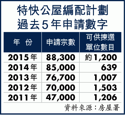 資助房屋一屋難求,根據房署數字,新一輪「白居二」計劃已接獲8,700宗申請,公屋輪候冊截至6月底更已有28.2萬宗申請,創下歷年新高。上樓遙遙無期,不少人因而轉向提供凶宅或條件較差單位的特快計劃。今年的特快計劃接獲約88,300份申請,同樣是歷年新高,與2011年僅47,000宗申請比較,5年間大增88%。今年的申請中有46,100宗都是單身申請人士,佔整體52%。
