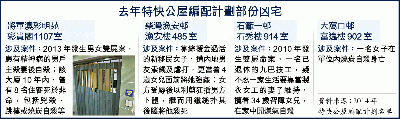 【本報訊】輪候公屋單位人數每創新高,令越來越多人為求上樓向凶宅埋手。房屋署最新數字顯示,專推凶宅的特快公屋編配計劃今年接獲破紀錄約88,300份申請,超額逾73倍創歷年新高。有連續3年申請公屋凶宅的劏房戶直言,自己是「死窮鬼」百無禁忌。公屋聯會主席王坤建議為多次申請計劃者加分,增加其上樓機會。