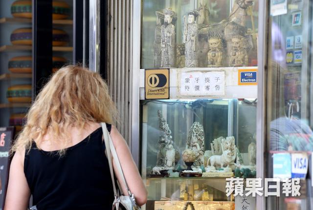 有嚤囉廟街賣古董的店舖負責人說,早前有海關連同漁護署等部門派發傳單,提醒售賣象牙古董及工藝品的店舖及攤檔,不要售賣不明來歷的象牙產品及原材料。他說,曾有小店非法出售一件100多元細小的象牙工藝品,結果被罰了5,000元。