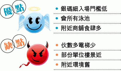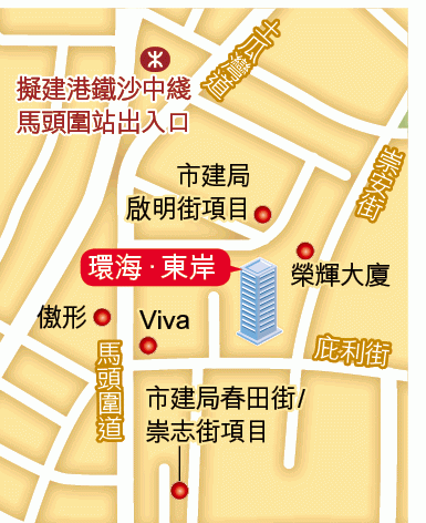 紅磡環海.東岸每層36伙的設計,將舊式洋樓的發展模式重新包裝,逾九成單位間隔開放式及一房,入場費約300萬元,對於一定要揀市區的買家具有相當吸引力。不過,戶型細、伙數多、電梯少的公屋式私人樓形象,加上環境舊的客觀條件,可能會局限其二手市場價值。