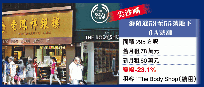 不過,零售市道由年初起一直向下滑,舖位缺乏其他租戶垂青,至7月份起業主已減價至185萬元,比現租金更低,但都無法租出,惟有與原租客磋商續約事宜。直到莎莎租約快將完結之前,才以140萬元續租,呎租438元,租金比半年前叫價累減120萬元,亦較舊租金下跌三成。