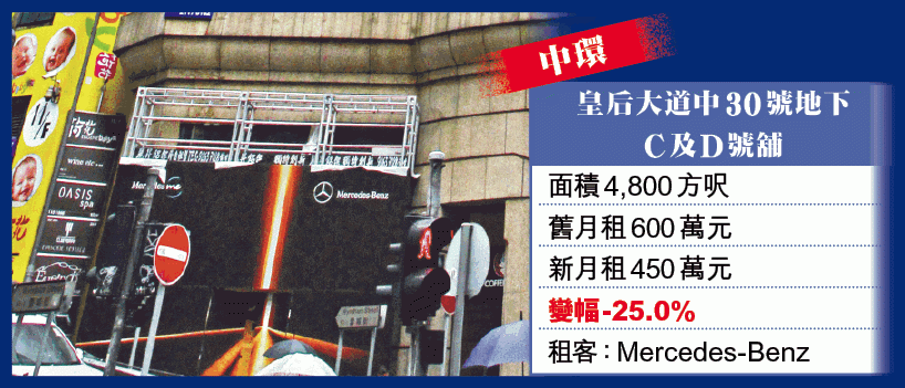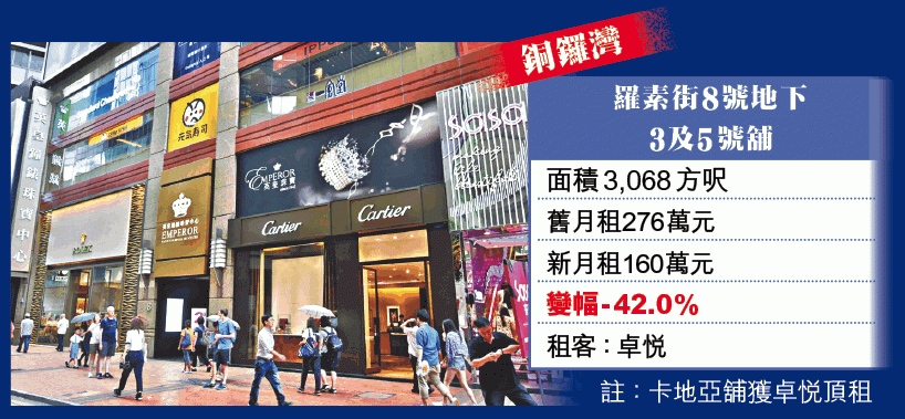 旺角、銅鑼灣、尖沙嘴及中環四大核心零售區舖租已普遍較三年前下跌兩至三成不等,近月更有名店棄守旗艦店。當中最傷為租金最貴的銅鑼灣,最新租金已暴瀉超過40%。中環及尖沙嘴一線地段租金都下挫23%至25%。