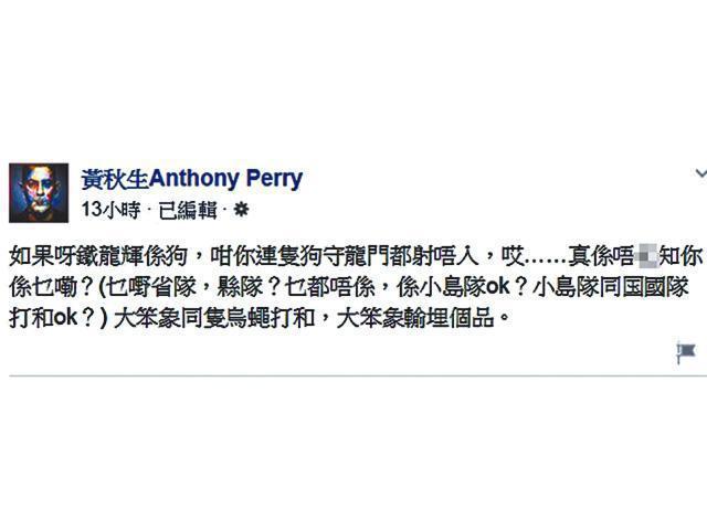 黃秋生前晚亦有在facebook留言:「如果呀鐵龍輝係狗,咁你連隻狗守龍門都射唔入,哎……真係唔X知你係乜嘞?(乜嘢省隊,縣隊?乜都唔係,係小島隊OK?小島隊同國隊打和OK?)大笨象同隻烏蠅打和,大笨象輸埋個品。」昨日秋生在電話補充說:「原本都驚驚哋(輸波),但港隊今次真係臨危不亂,打出team work。」