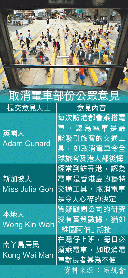 【本報訊】引起社會各界爭議的取消中區路段電車規劃申請,公眾諮詢期昨屆滿,截至周三已累積1.57萬份意見,絕大部份屬反對意見,市民狠批建議「白癡」,質疑欠缺數據支持,只屬維園阿伯胡扯,有來自新加坡的旅客更不惜越洋提交反對意見,促當局保留電車,直言不能想像沒有電車的香港,城規會暫定下月23日討論申請。
