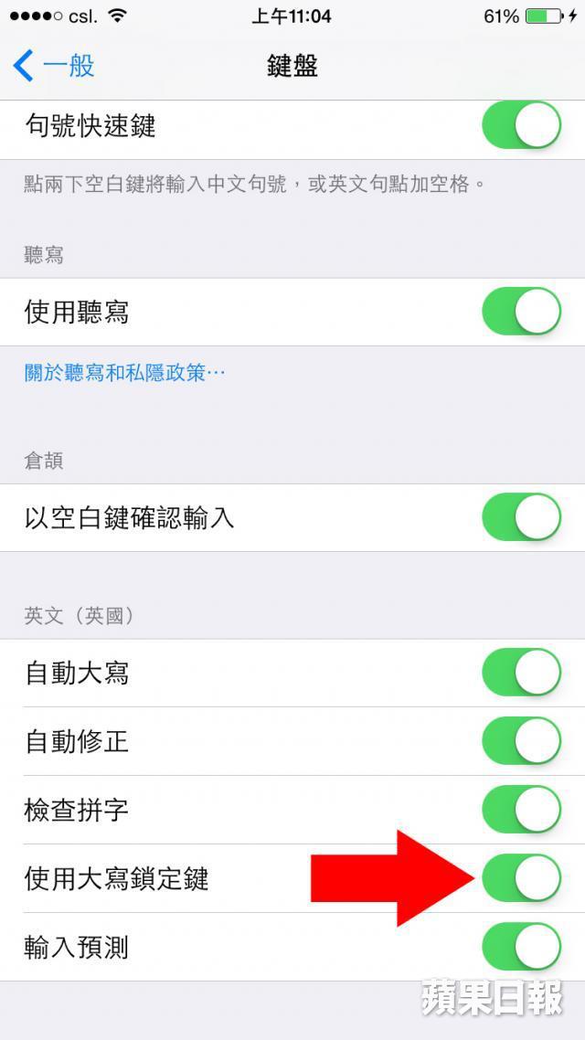 另外,如果發覺無法開啟這個功能,可以到「設定」→「一般」→「鍵盤」,檢查有冇打開「使用大寫鎖定鍵」即可。記者:許福合
