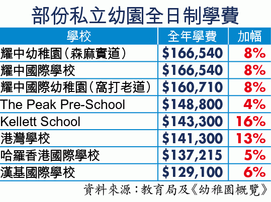 【本報訊】私立幼稚園今年也大幅加費,全港全日制學費最高的耀中加8%,學費衝破16萬元大關;甚多名人子女入讀的哈羅香港國際學校也加學費5%。