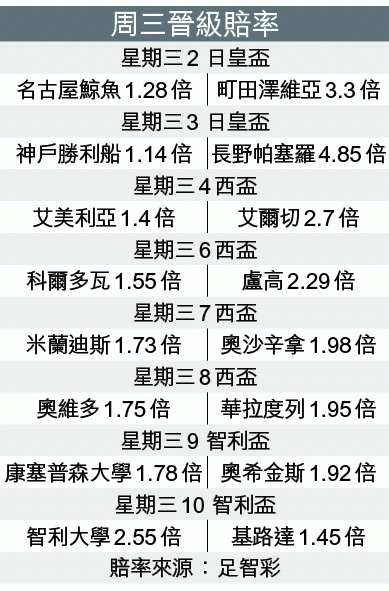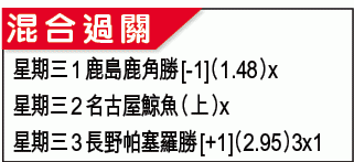 同日名古屋鯨魚於市港球場鬥另一支丙組球隊町田澤維亞。鯨魚在日聯盃八強出局後,將注意力放在日皇盃上;儘管缺永井謙佑及路華高域等主力,不過仍有楢崎正剛、田中鬥莉王及小川佳純等猛將壓陣,相信夠贏實力麻麻的町田澤維亞,「讓球」讓半/一上盤可捧。