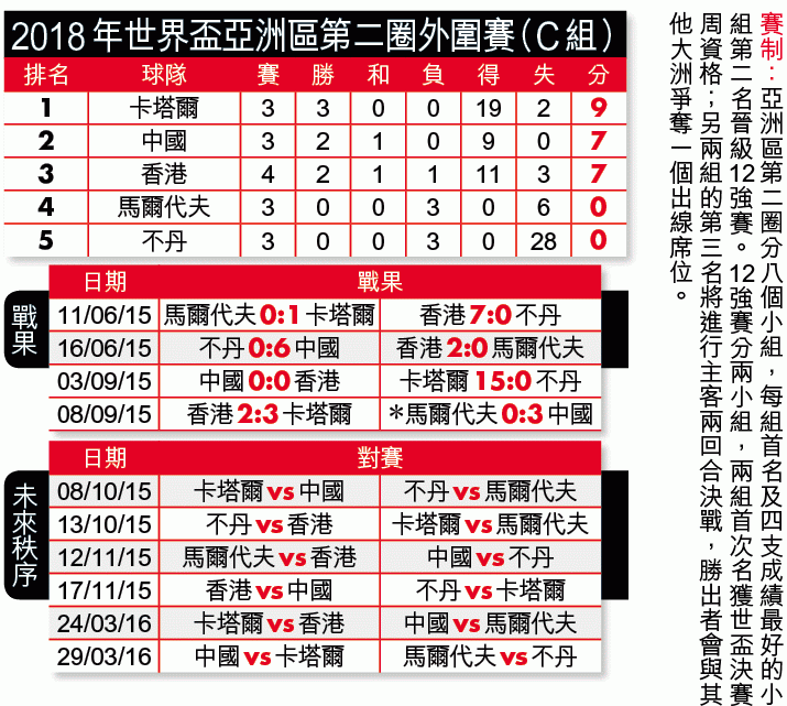 世盃外亞洲區C組另一場,國足在瀋陽出戰,靠于大寶梅開二度,以3:0贏馬爾代夫,壓過同日輸波的港足,升上次名。
