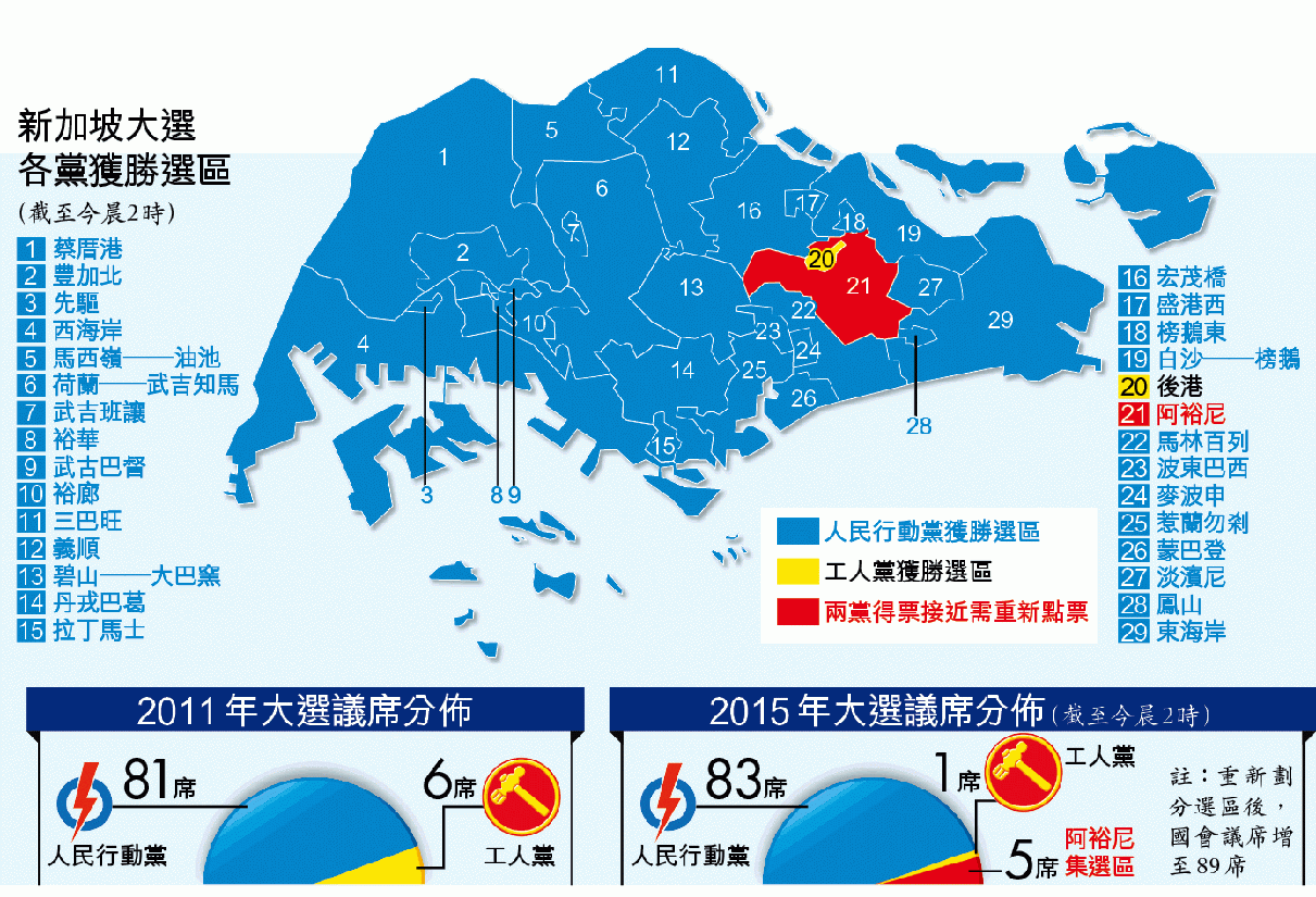 新加坡昨日舉行失去國父李光耀之後第一次大選,也是首次名副其實的全民投票。在沒有選區自動當選下,全體246萬名選民用手上一票,決定國家未來5年的命運。執政50年的人民行動黨在總理李顯龍領導下,面對歷來最大挑戰,但在李光耀逝世和50周年國慶的唱好行動黨效應下,為上屆大選的最差成績成功止血回穩。截至今凌晨2時點票結果,人民行動黨至少奪83席,令反對黨的大進擊無功而還。