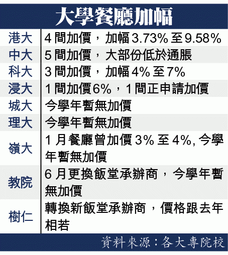 至於科大本學年有3間餐廳加價,食品加價5毫至3元,加幅約4%至7%。浸大則有一間餐廳加價,平均加幅6%。