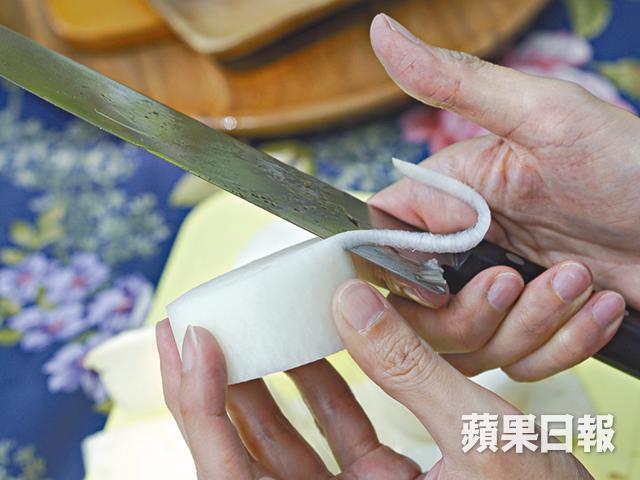 蘿蔔作「面取」處理,即切去起角的邊緣,以防烚蘿蔔時令邊緣撞崩,破壞外觀,是日本人的方法。