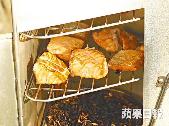 較難熏熟的食物置於煙熏爐下層,即三文魚,魚肉向下置架上;溏心蛋切開放上層,芝士同樣處理,熏約5分鐘即成。