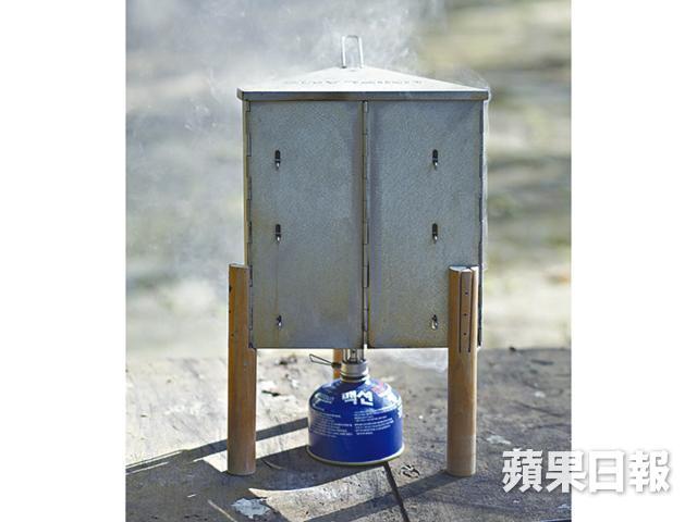 煙熏箱底部置雜木屑一撮於鐵盆中,以露營氣爐於底部加熱。