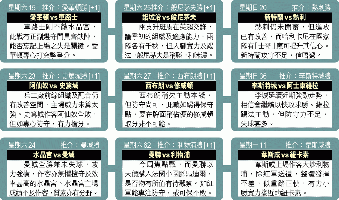經過兩輪國際賽賽期後,各地聯賽又回復正常,而今周英超有多場大戰,除衞冕車路士作客愛華頓備受關注外,曼聯迎利物浦的「雙紅會」亦是焦點,而今周重心是剛挫曼聯的史雲斯作客屈福特的平手盤。