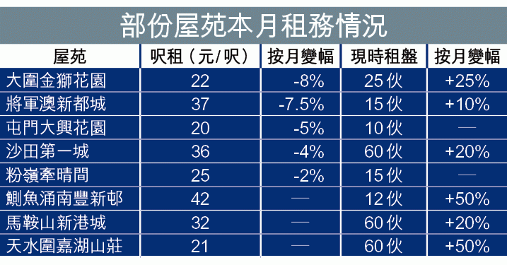 【本報訊】暑假租務高峯期過後,租賃熱潮開始降溫。業主不願平價沽售,轉賣為租,加上市民擔心通脹持續,買入「磚頭」收租趨增,令市場租盤供應增多,連同新入伙盤租盤湧現,多重夾擊下,拖累私樓租金受壓,新界區最為明顯。沙田第一城兩房細戶,月租連環失守1萬元。深水埗丰匯三房業主索性減租4,000元,以2.4萬元出租單位。