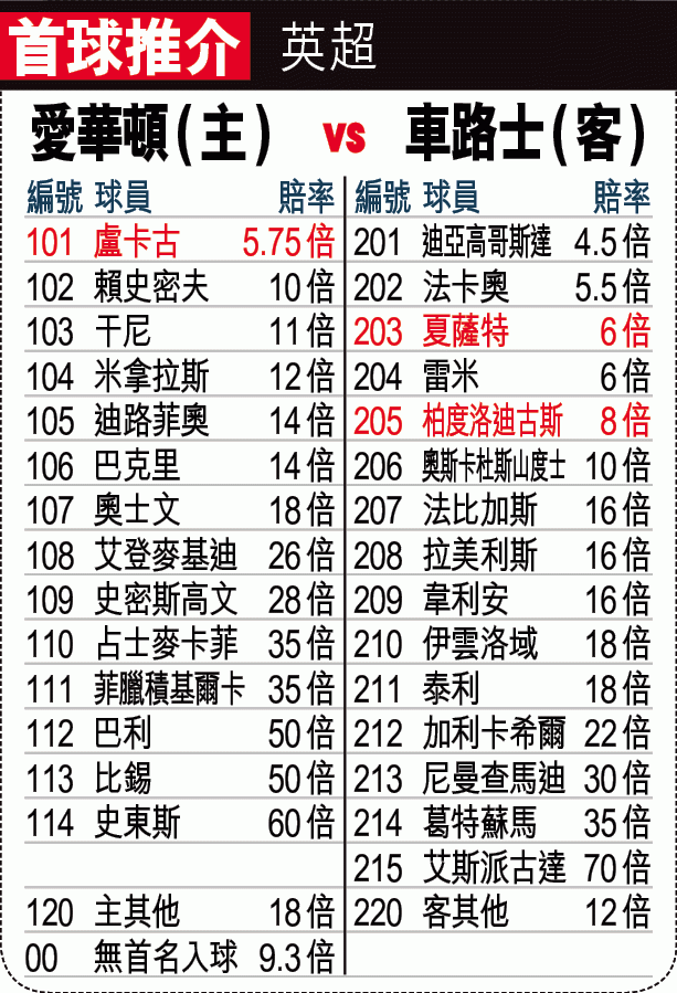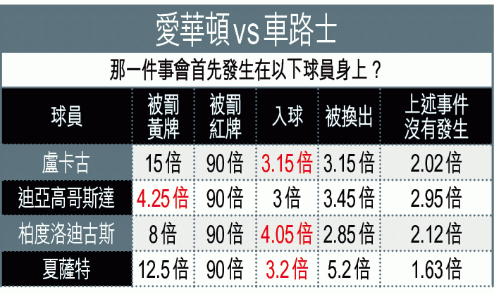 愛華頓連同英聯盃在內,近五場取得一勝三和一負,狀態麻麻。儘管盧卡古及巴克里於聯賽各入兩球,惟球隊攻力未見太強。此外,現時他們亦受傷兵困擾,除缺少巴尼斯及湯卡華利,侯活及白賴仁奧維度亦有傷。新兵艾朗連儂、李安度洛迪古斯及拉美路富尼斯摩利雖可披甲,惟級數未算太高。還要留意,他們近年與車仔交手處下風,六戰一勝五負,其中上季於主場居然慘輸3:6。信車仔可反底成功,贏波開出讓半/一上盤。