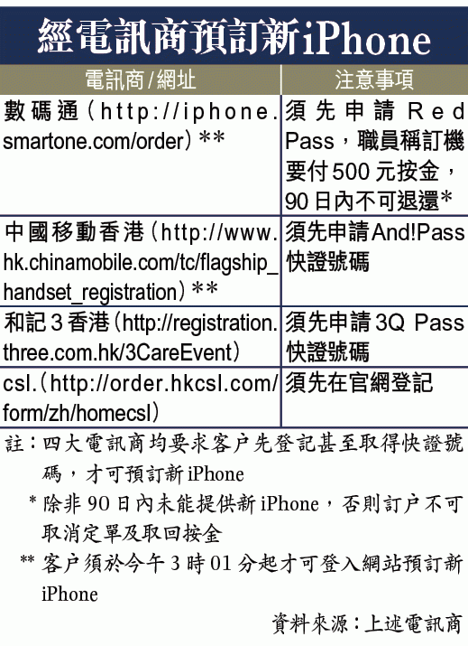 【本報訊】今日下午3時01分,蘋果官方網頁接受預訂新iPhone後,本地四大電訊商亦隨即展開新一輪iPhone銷售戰,在無法提前公佈月費情況下,數碼通已率先要求網上預定iPhone者繳付500元按金,並且不能隨意取消訂單及退按金。