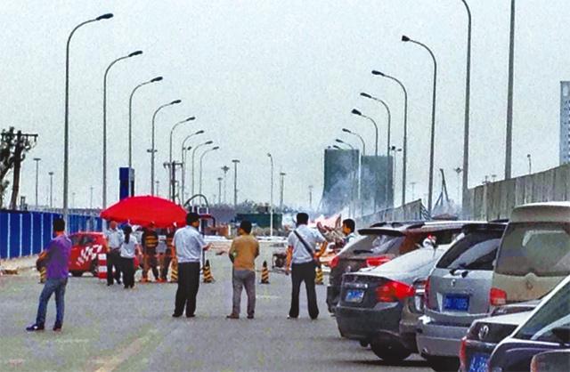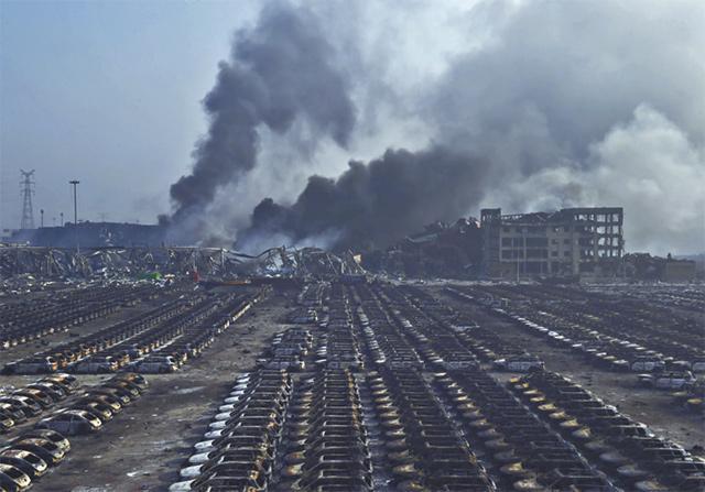 記者徒步繞行,災區戒備森嚴,附近每個可眺望災場的屋苑都有武警站崗。費盡周折天黑時抵達爆炸現場附近,但遇武警攔截,稱該處危險:「裏面還在燒呢!」記者隱約見到遠處火光。距爆炸點1.2公里萬通新城業主王先生表示:「爆炸現場仍有大量化學品,每逢下雨都會起火,就像今天。」明火還伴着成份不明的煙霧。萬通新城是附近少數沒被封的屋苑,大部份門窗被毀,甚至有電梯門被炸裂,仍有居民原址居住。王先生夫婦則稱不敢回來住,只是來收拾。