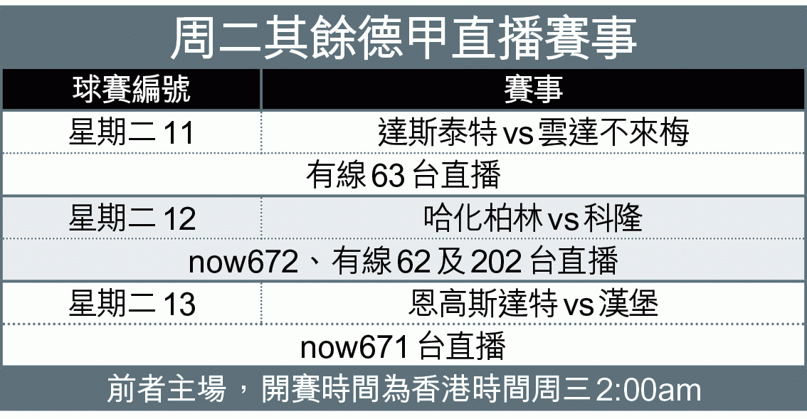 至於今季兩支升班馬達斯泰特及恩高斯達特,表現亦較予期中好,其中達斯泰特要戰至上仗鬥班霸拜仁慕尼黑時,才被破今季不敗身,在周二迎戰表現復甦的雲達不來梅時,可吼入球開「大」。達斯泰特今役可「夫添」,主力如中場馬素希拿等均可以候命,不難在不來梅身上取得入球。論人腳,不來梅本來稍勝,可惜球隊今役有中場巴菲迪被罰停賽,後衞辛迪亞高加西亞又上陣成疑,就算中場祖奴蘇域病癒可以復出,亦不宜過份高估。不過,由於不來梅踢法主動又攻力強,因此,是役可以取「大」。