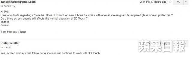 自iPhone 6s發佈後,大家都關注其3D Touch功能,亦有不少用家擔心貼上芒貼後,會否影響其觸控功能。外國網站3D Techtronics就發了電郵至Apple市場部副經理Philip Schiller,直接問了這個問題,Apple的官方回答就是:「可以,但跟着我們的指引去用!」
