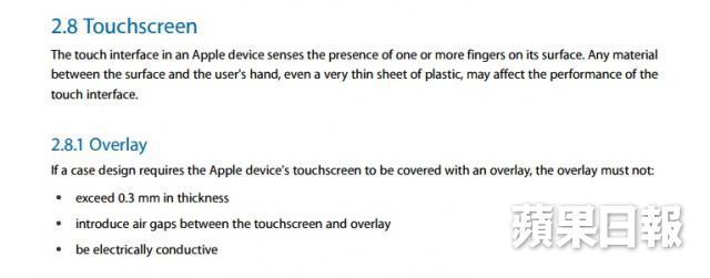 Apple的電郵回覆,只是叫記者跟從官網上的指引購買芒貼,亦即不能厚過0.3mm、屏幕同保護膜之間不可以有空隙和芒貼要是可導電物料。其實市面上一般的芒貼很難超過0.3mm厚度,但鋼化玻璃芒貼最厚可達0.6mm,所以大家購買芒貼時要特別留意這點,可以選擇貴少少買官方認證的,以免買回來用不着,嘥錢呀!